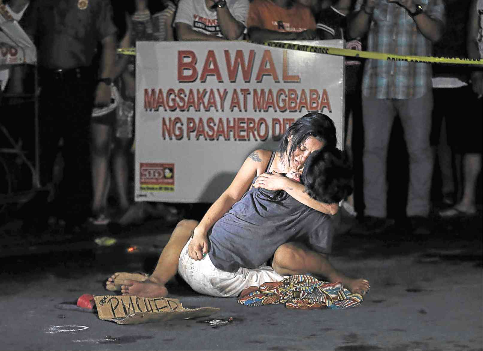 Photo credit: “LAMENTATION: A weeping Jennelyn Olaires hugs partner Michael Siaron, 30, a pedicab driver and alleged drug pusher, who was shot and killed by motorcycle-riding gunmen near Pasay Rotonda on Edsa. He was one of six killed in drug-related incidents in Pasay and Manila yesterday. RAFFY LERMA” www.inquirer.net