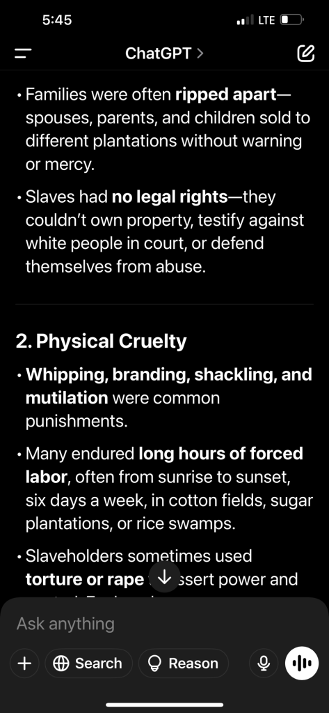 “Whipping, branding, shackling, and mutilation were common punishments. Many endured long hours of forced labor, often from sunrise to sunset, six days a week, in cotton fields, sugar plantations, or rice swamps. Slaveholders [imperialist, white-supremacist, predatorial-capitalist, patriarchal oligarchs] sometimes used torture or rape to assert power and control. Enslaved women were especially vulnerable to sexual exploitation.“ – ChatGPT