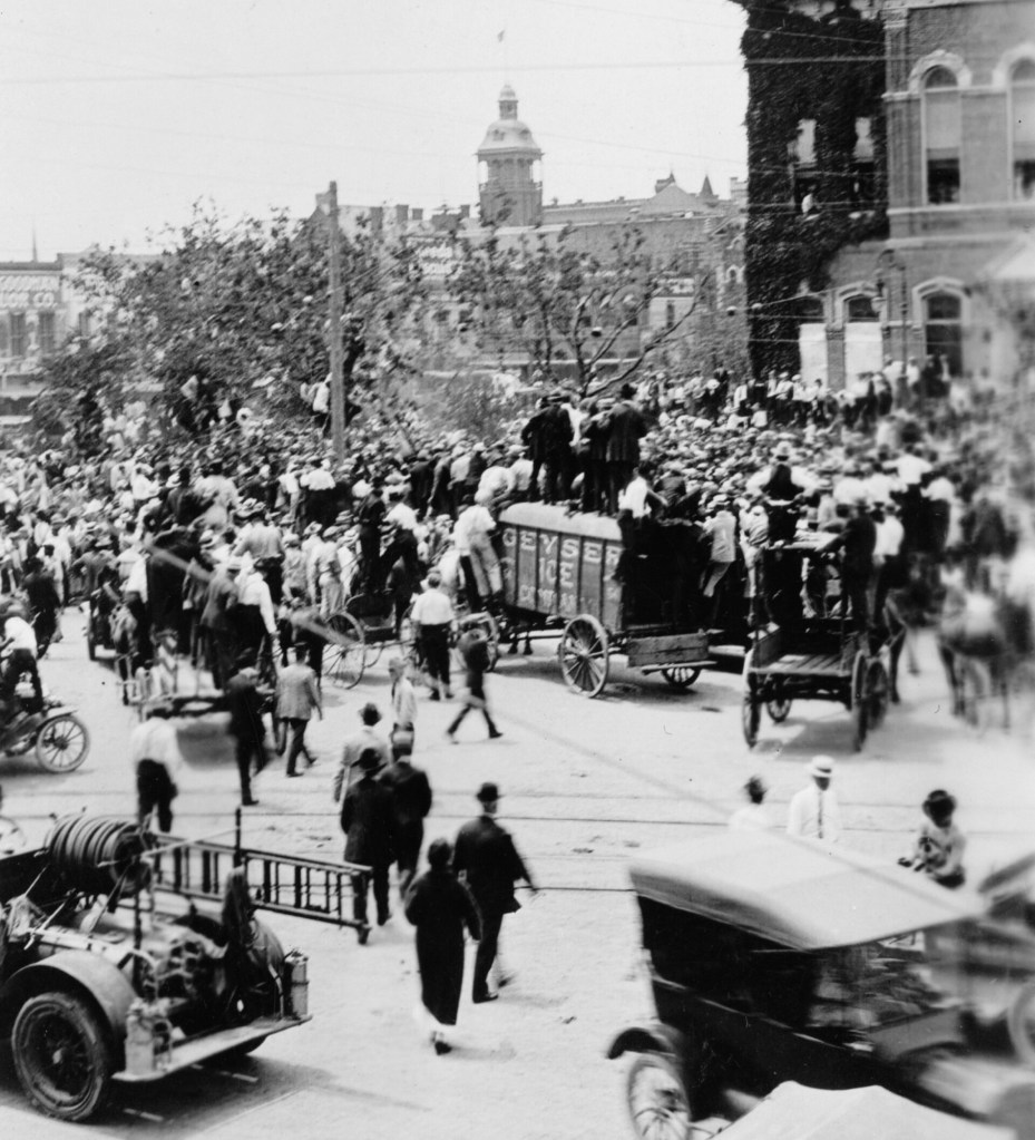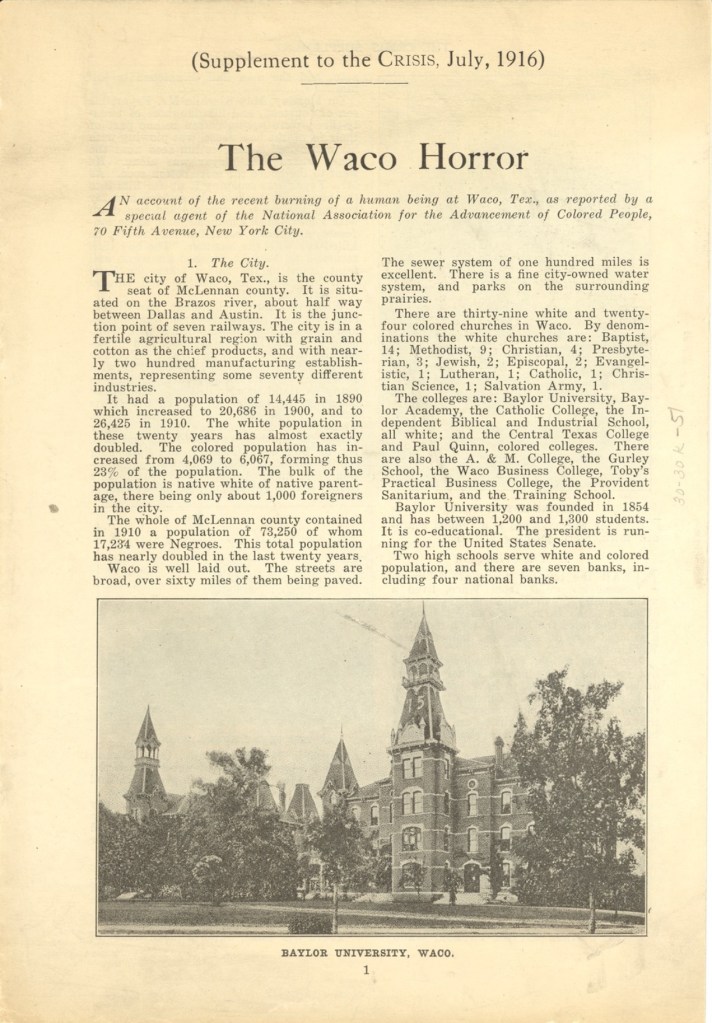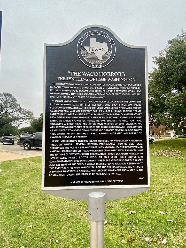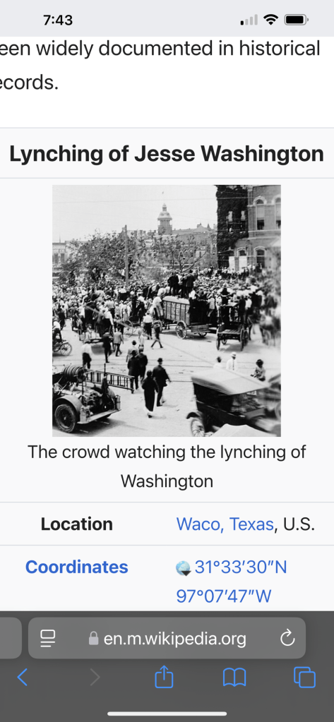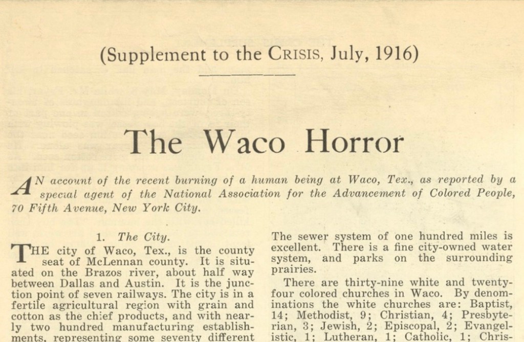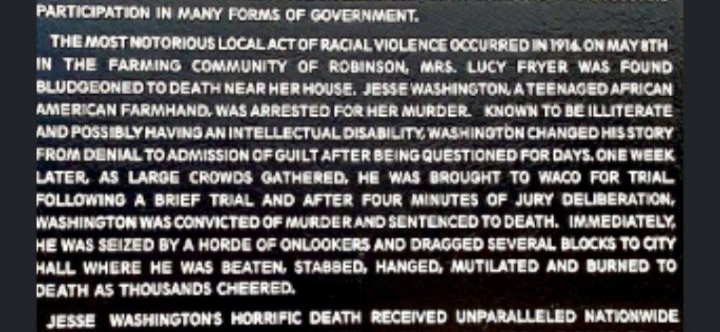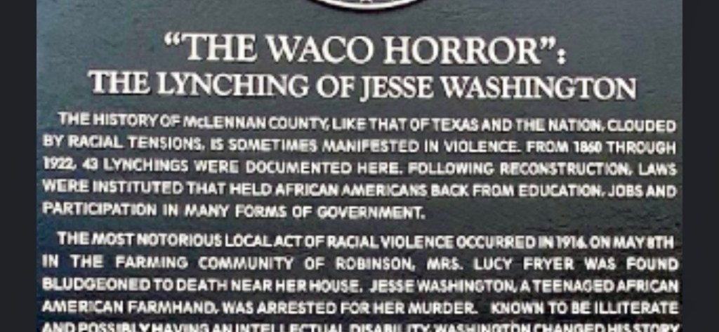 “The ‘exciting occurrence’ mentioned in a Waco, Texas, newspaper on May 16, 1916, referred to one of the most horrific public lynchings in the history of the United States. On May 15, 1916, Jesse Washington, a mentally disabled, 17-year old black laborer, was beaten, stabbed, mutilated, hanged and burned to death on the Waco town square, before an audience of 10-15,000 screaming, cheering spectators.” – Patricia Bernstein, “The Lynching of Jesse Washington”