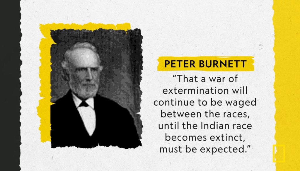 “Between 1846 and 1873, it is estimated that settlers killed between 9,492 and 16,094 indigenous Californians; up to several thousand were also starved or worked to death. Forced labor, kidnapping, rape, child separation and forced displacement were widespread during the genocide, and were encouraged, tolerated, and even carried out by American officials and military commanders.” – Wikipedia