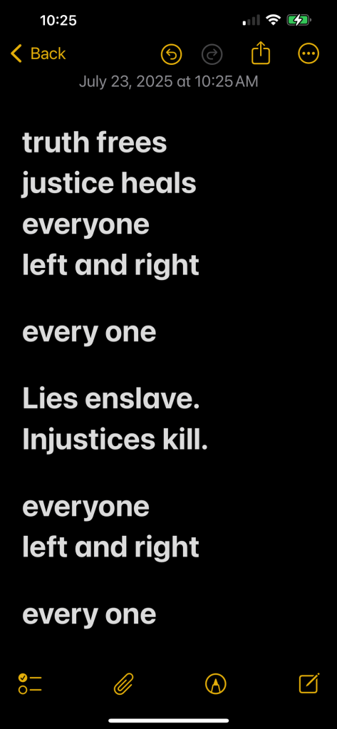July 23, 2025July 23, 2025 justice heals… every one… truth frees justice heals everyone left and right every one Lies enslave. Injustices kill. everyone left and right every one Share this: Share on Facebook (Opens in new window) Facebook Share on X (Opens in new window) X Like Loading...