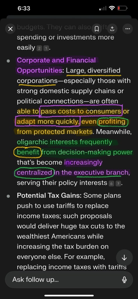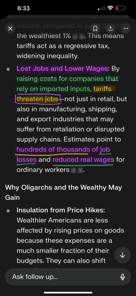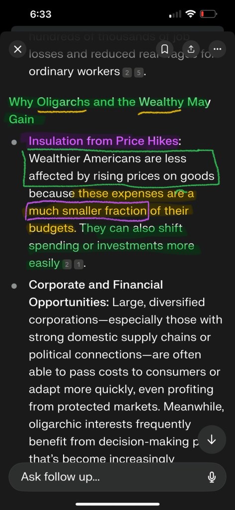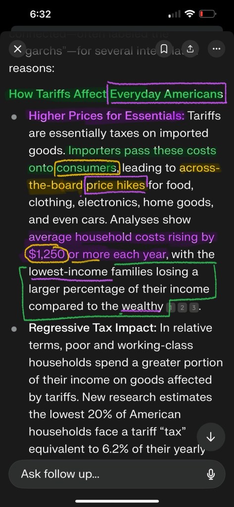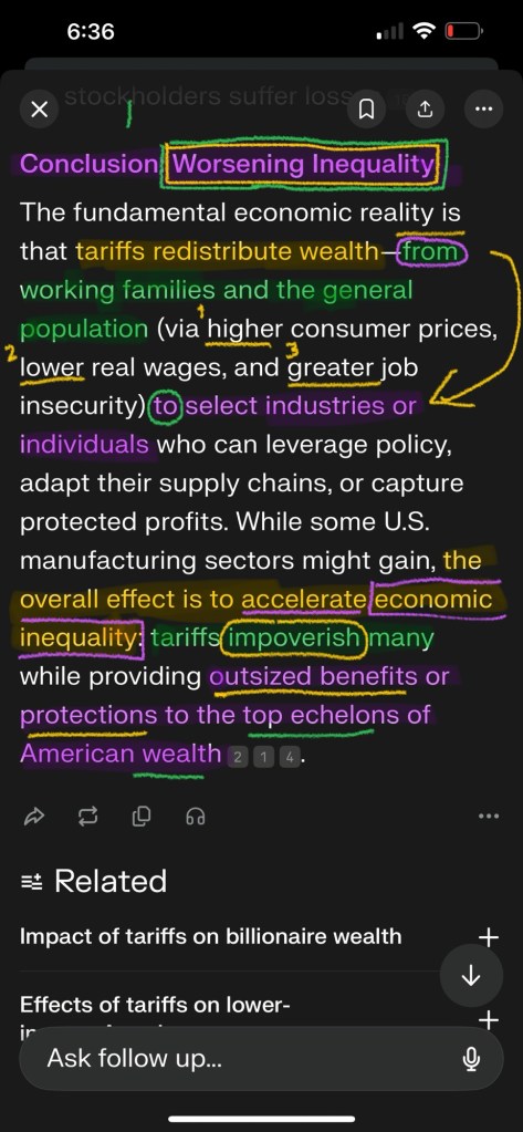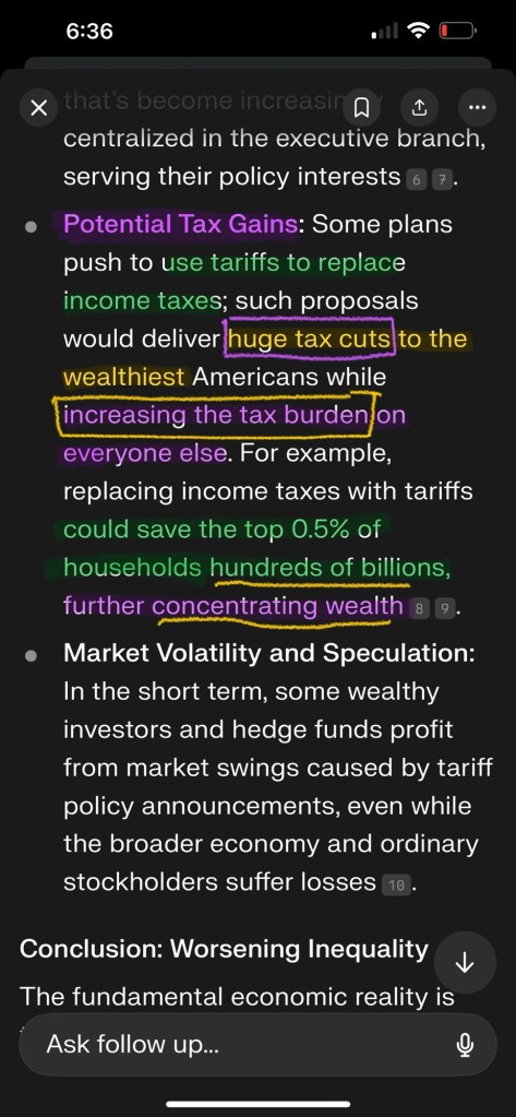 “Tariffs in the U.S. are widely expected to make everyday Americans poorer while offering significant advantages to the already wealthy and well-connected…” – perplexity (AI)