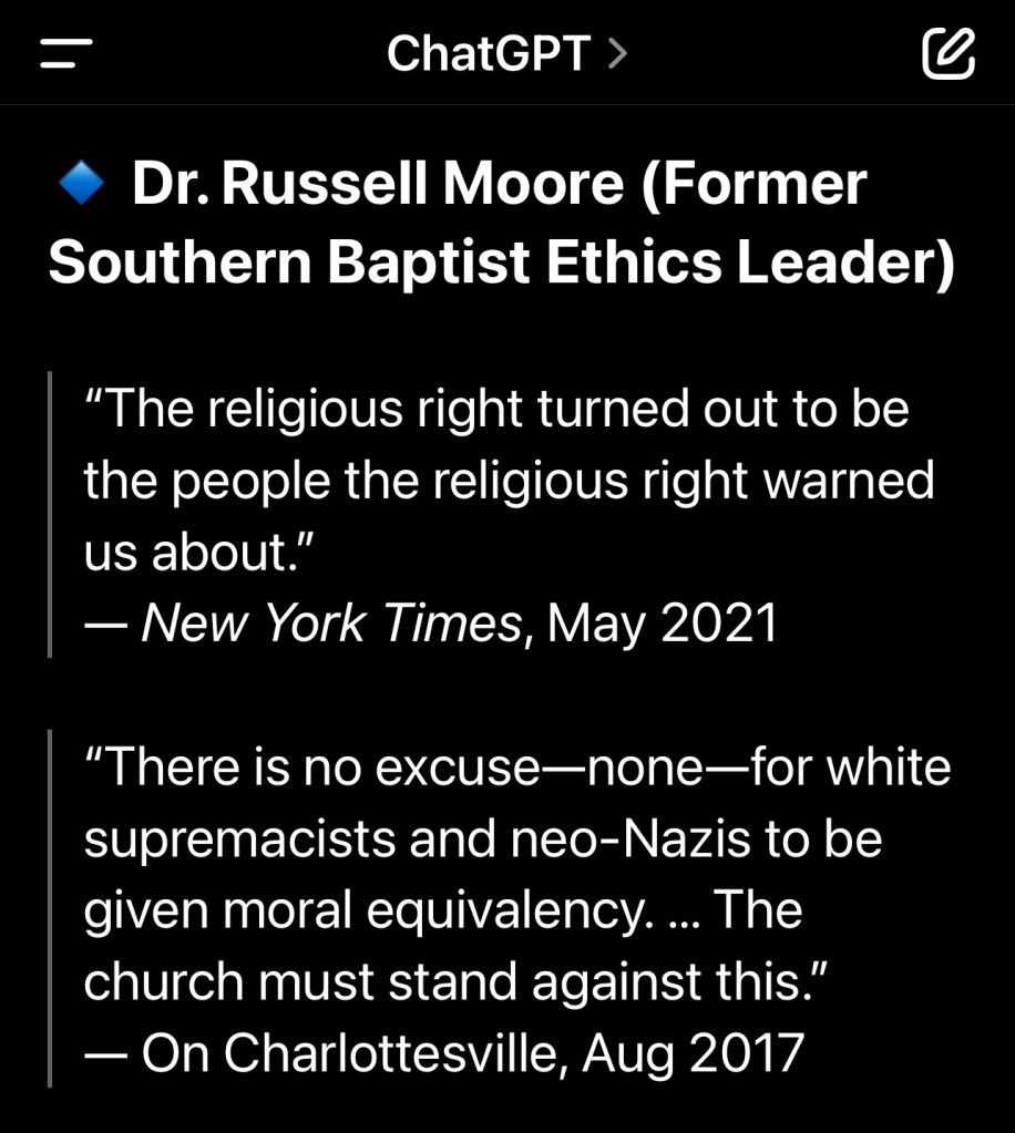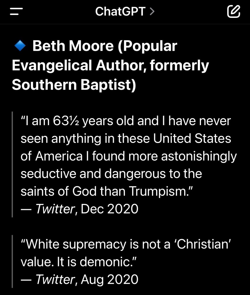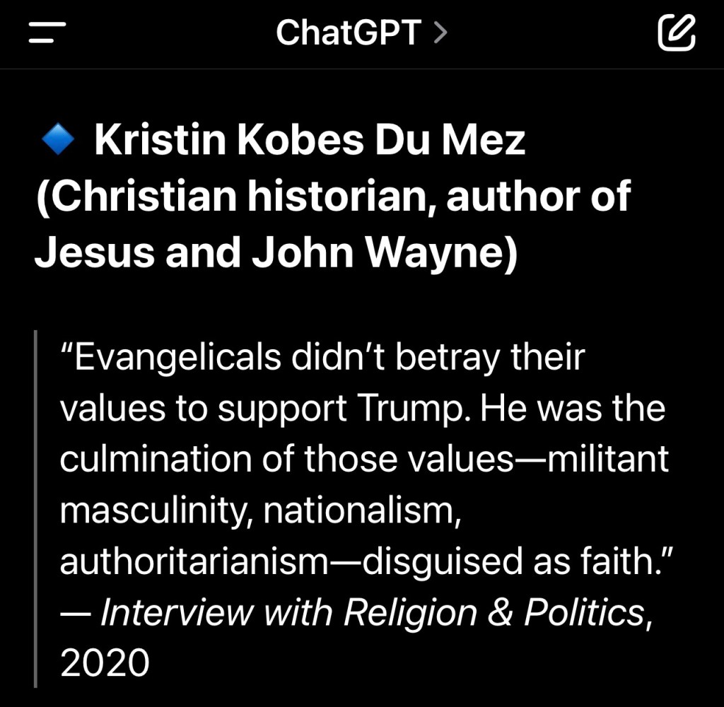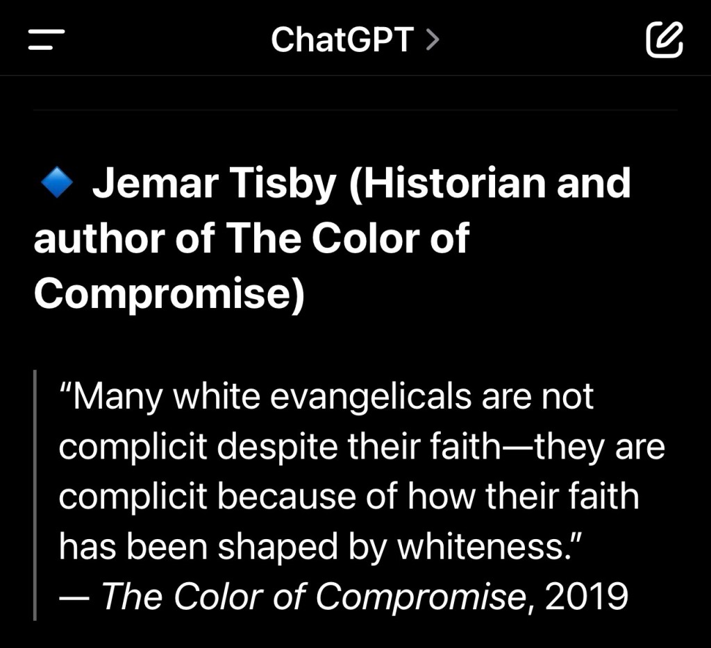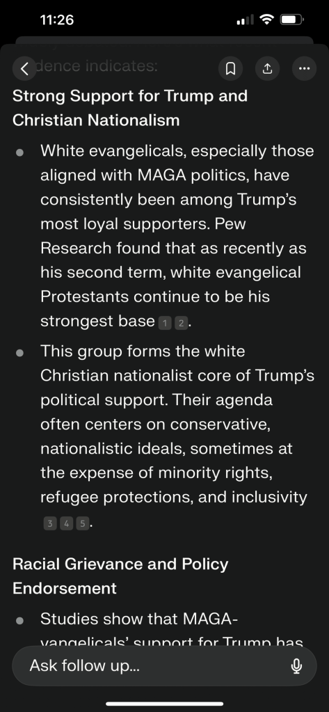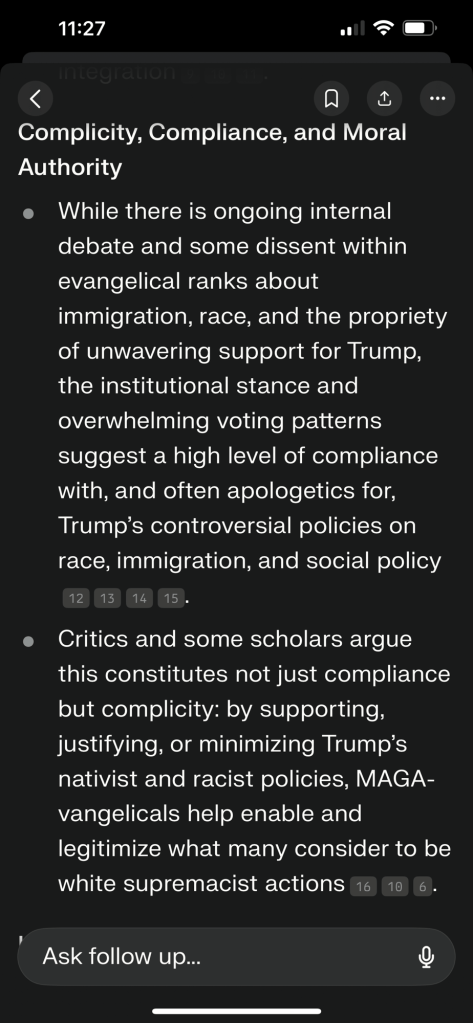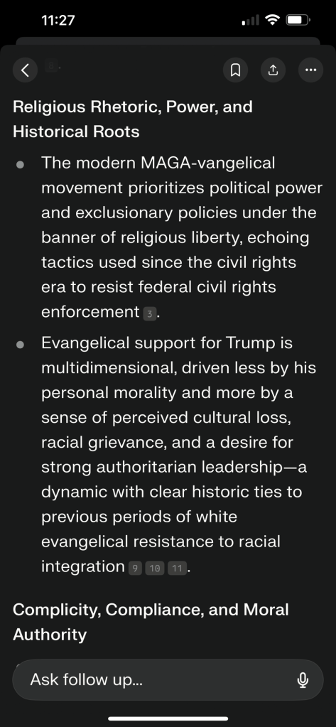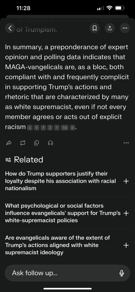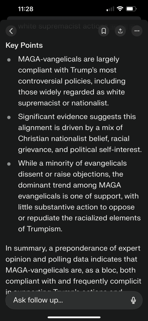 “In summary, a preponderance of expert opinion and polling data indicates that MAGA-vangelicals are, as a bloc, both compliant with and frequently complicit in supporting Trump’s actions and rhetoric that are characterized by many as white supremacist, even if not every member agrees or acts out of explicit racism.” – perplexity (AI)