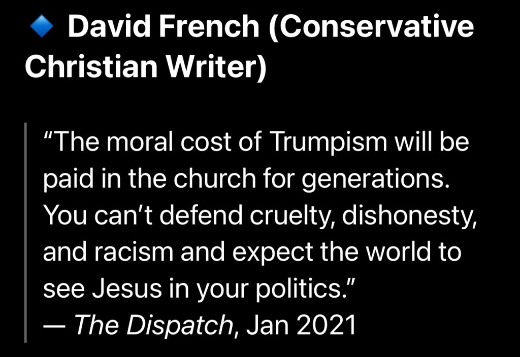 “The moral cost of Trumpism will be paid in the church for generations. You can’t defend cruelty, dishonesty, and racism and expect the world to see Jesus in your politics.” – David French (Conservative Christian Writer), The Dispatch, January 2021