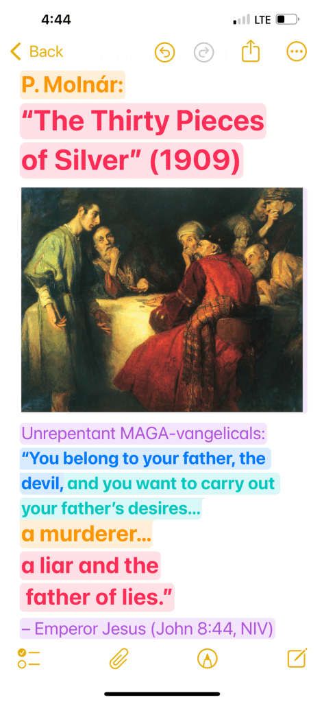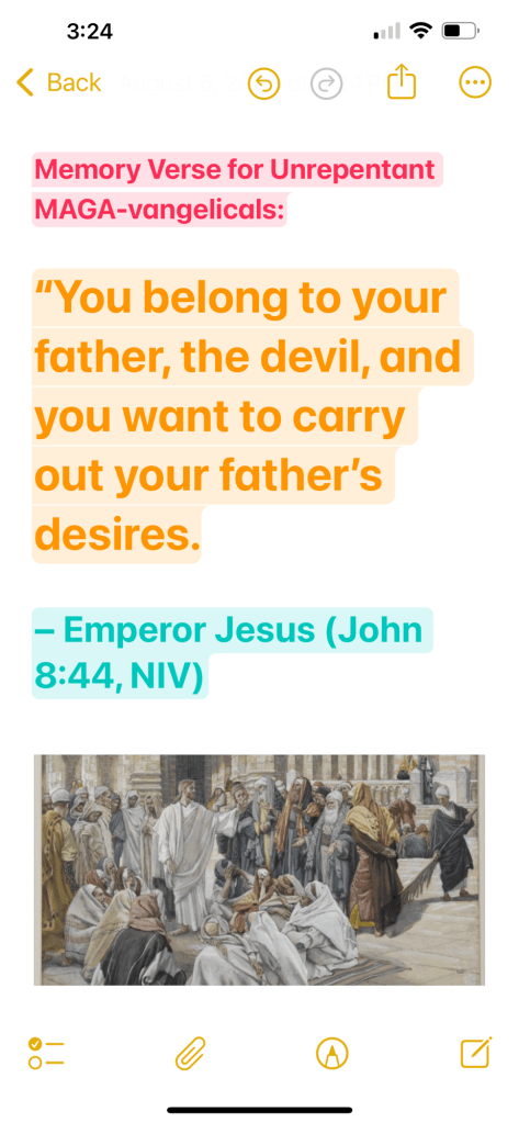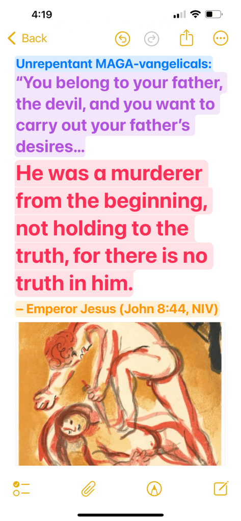Unrepentant MAGA-vangelicals: “You belong to your father, the devil, and you want to carry out your father’s desires. He was a murderer from the beginning, not holding to the truth, for there is no truth in him. When he lies, he speaks his native language, for he is a liar and the father of lies.” – Emperor Jesus (John 8:44, NIV)