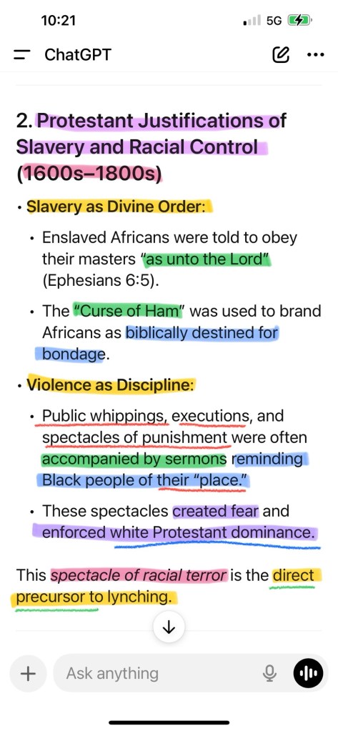 “Protestant European colonizers set the stage for a sacred culture of racial violence, where religion was used to justify conquest, enslavement, and terror. Lynching in the U.S. was not an aberration but a continuation of the colonial project — a public, ritualized act of control framed as defending God’s order. Christianity was the language of legitimacy for both conquest and lynching…” – ChatGPT