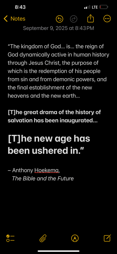 “The kingdom of God, therefore, is to be understood as the reign of God dynamically active in human history through Jesus Christ, the purpose of which is the redemption of his people from sin and from demonic powers, and the final establishment of the new heavens and the new earth. It means that the great drama of the history of salvation has been inaugurated, and that the new age has been ushered in.” – Anthony Hoekema, The Bible and the Future