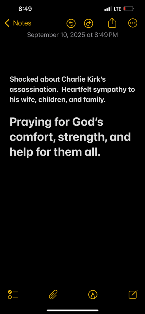 Shocked about Charlie Kirk’s assassination. Heartfelt sympathy to his wife, children, and family. Praying for God’s comfort, strength, and help for them all.
