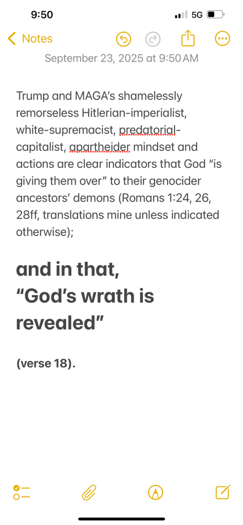 Trump and MAGA’s shamelessly remorseless Hitlerian-imperialist, white-supremacist, predatorial-capitalist, apartheider mindset and actions are clear indicators that God “is giving them over” to their genocider ancestors’ demons (Romans 1:24, 26, 28ff, translations mine unless indicated otherwise); and in that, “God’s wrath is revealed” (verse 18).