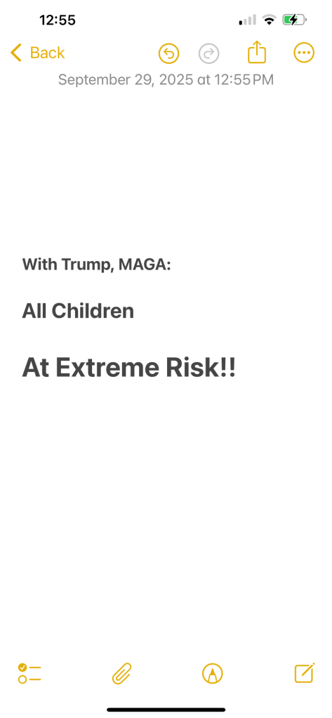 September 29, 2025 Trump, MAGA: Children At Extreme Risk Trump, MAGA: Enemies of the State Share this: Click to share on Facebook (Opens in new window) Facebook Click to share on X (Opens in new window) X Like Loading...