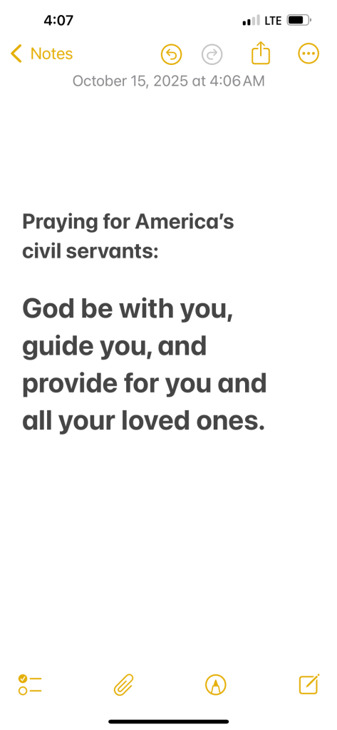 October 15, 2025 Praying for America’s Civil Servants God, take care of our civil servants and all their loved ones… #FastAndPrayForFedEmployees Share this: Share on Facebook (Opens in new window) Facebook Share on X (Opens in new window) X Like Loading...