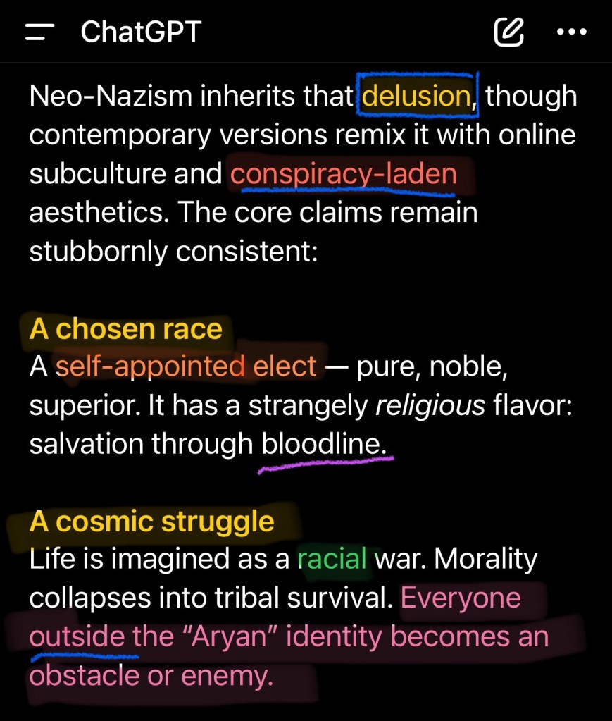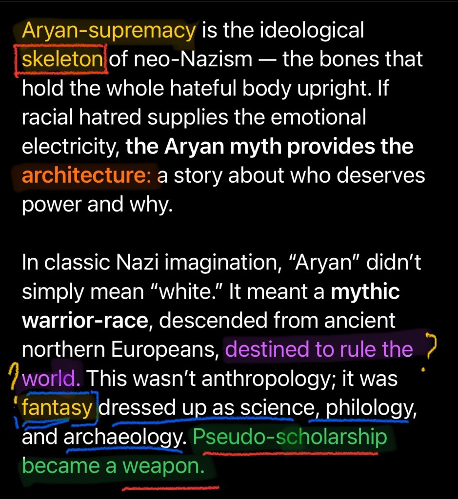 “The ‘Aryan’ myth is one of the most enduring and dangerous racial fantasies in modern history. Its meaning has mutated dramatically over time—from a linguistic category, to a romanticized ancient people, to a racist doctrine used to justify genocide, and finally into the ideology of modern white supremacism and neo-Nazism.” – ChatGPT